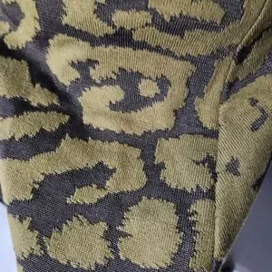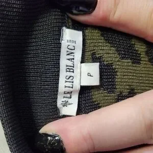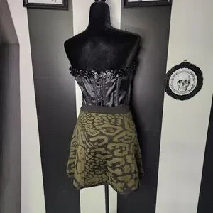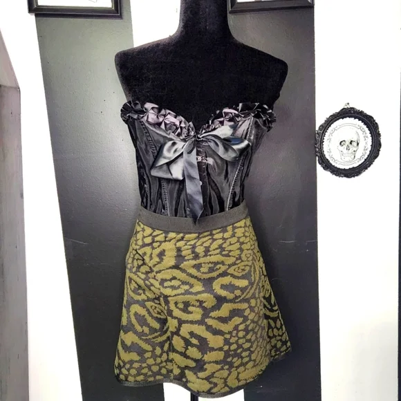 Elegant black corset top with a bow detail. Paired with a stylish patterned skirt in green and gray.