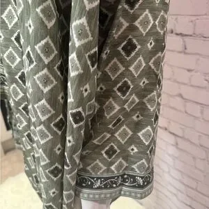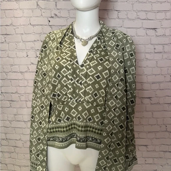 Stylish green patterned top perfect for any occasion. Features a unique design that adds a touch of elegance to your wardrobe. Match it with the top listed in shop for a an elegant look!