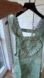 Sage green apron with white polka dots. Features ruffled shoulder straps and long ties. Lightweight, feminine design. Great for cooking or crafting.