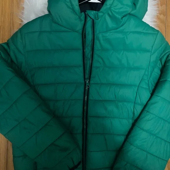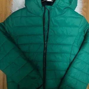 Stylish green puffer jacket with a hood. Perfect for cold weather.