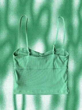 Green ribbed cami crop top with adjustable straps and ruched front detail.