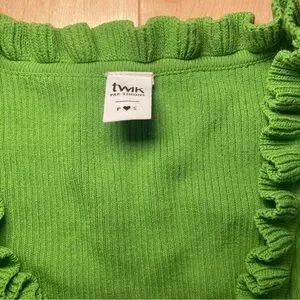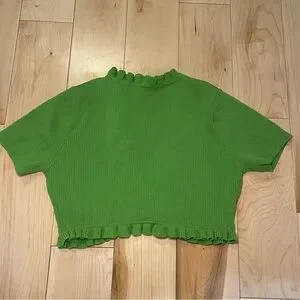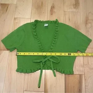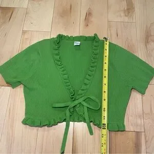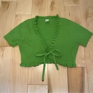 Bright green ribbed knit cropped cardigan with a tie-front closure. V-neckline, ruffled trim along the neckline and hem, and short sleeves. Stretchy fabric.