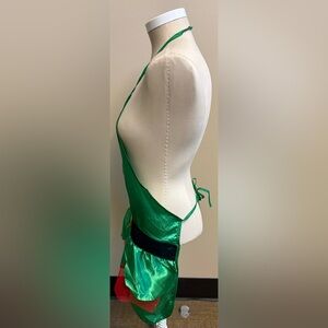 Description: Vibrant green satin apron. Features a gold buckle detail. Perfect for festive occasions.