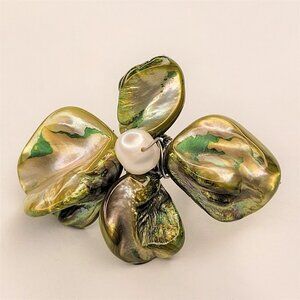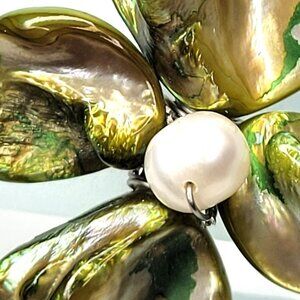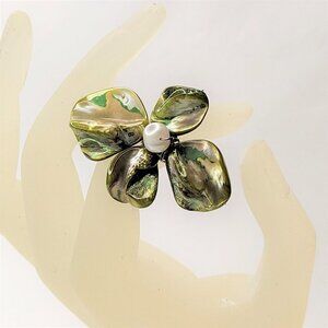 Green Shell with Freshwater Pearl Bead Asymmetric Flower Adjustable Ring