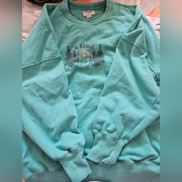 Stay cozy with the Green Baggy Sweater, perfect for casual outings. This is a pre-owned American Eagle scenic nature sweater. This is a size xl with a baggy fit. This sweater is pilled all over.