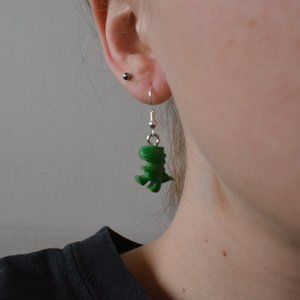 Handmade green Tyrannosaurus rex dinosaur dangle earrings, made from 100% recycled HDPE plastic and hypoallergenic (no nickel or alloy) silver hooks. Super lightweight as well. Great for sensitive ears and comfortable all-day wear.