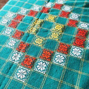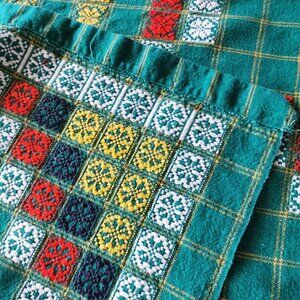Green Tablecloth Retro Embroidered Geometric 57x77 Woven Floral Motif Yellow Checked White Squares Needlework