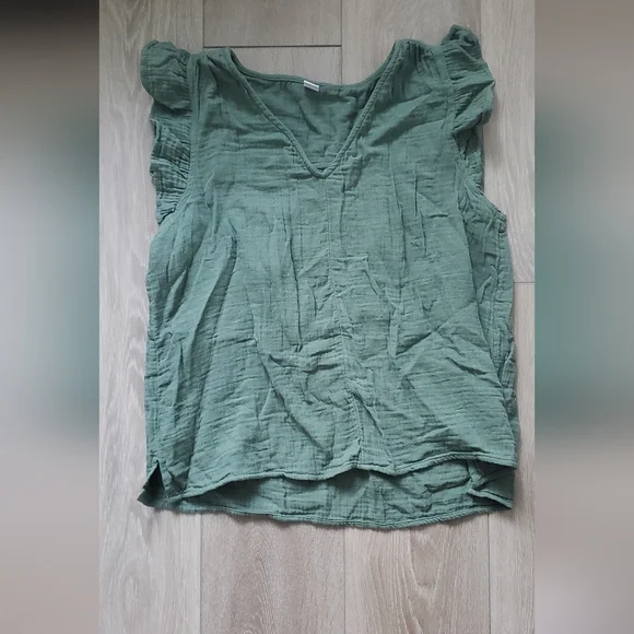 Sleeveless green tank with ruffles over the shoulder. Never worn.