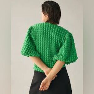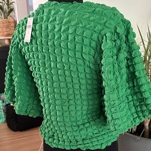 This vibrant green blouse features a boxy, oversized fit with stylish puff sleeves that end at a 3/4 length.