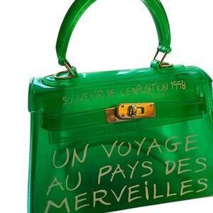 Gorgeous transparent green vinyl top-handle bag with white lettering. Inspired by the famous 1998 exhibition style. 9/10 condition, only worn 1-2 times.