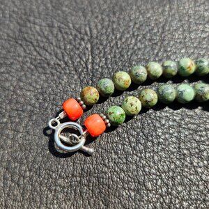 An absolutely gorgeous set of green turquoise round beads, accented with a bright red piece of sea bamboo.