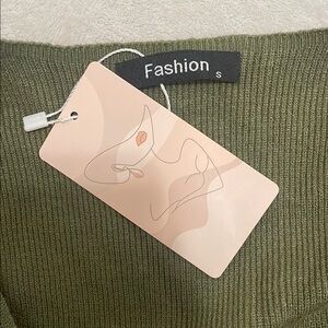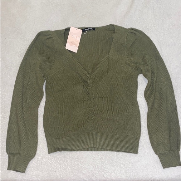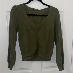 This green V-neck sweater combines a classic design with a ribbed texture, offering a comfortable and stylish fit. Its long sleeves and slightly cropped style make it a versatile addition to any wardrobe. Perfect for layering or wearing on its own, this sweater is crafted from a soft knit fabric for everyday wear.