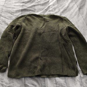 Army green v-neck, long sleeve sweater.