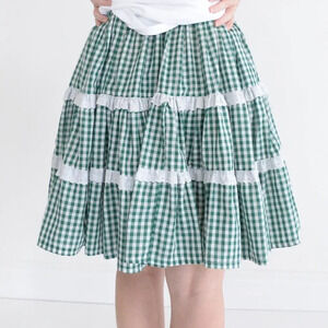 Crafted with a green and white checkered gingham fabric, this mini skirt evokes images of idyllic countryside picnics and rustic charm. The addition of lace trim adds a touch of femininity and vintage flair, perfect for embracing the cottagecore aesthetic.