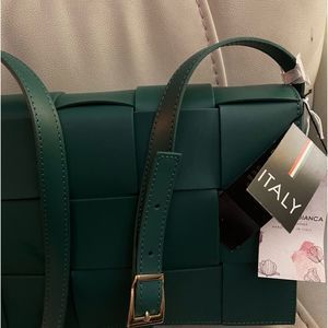 Elevate your style with the woven leather bag. This elegant green accessory is perfect for any occasion.