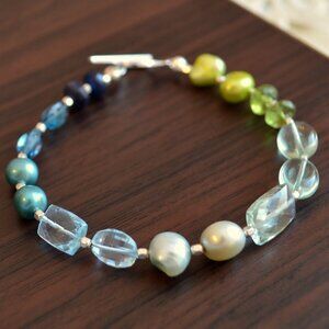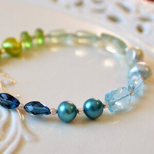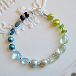 This blue and green beaded bracelet is perfect for Summer. Using several types of gemstones and pearls, this piece blends from bright lime green at one end, to the darkest navy at the other. In between are shades of teal, blue, aqua and soft green. Four shades of freshwater pearls are used, and the gemstones include kyanite, london blue topaz, sky blue topaz, green amethyst, fluorite and peridot. In between each bead is a tiny sterling silver bead. A simple toggle clasp secures the bracelet and makes it easy to put on and remove.