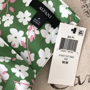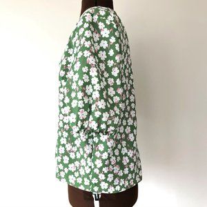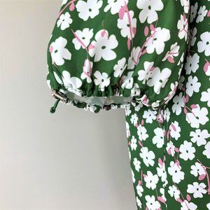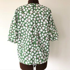 Floral top with elbow length puff sleeves, the sleeve opening is adjustable as it has elastic cord with toggle. The top has a button closure at the back. The green is brighter than what is shown in the picture. Belt is not included as it is used as picture prop.