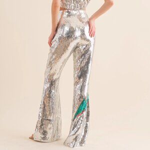 These pants feature a striking combination of silver and green hues, crafted in a boot cut and flare style. The fitted silhouette through the thigh transitions into a dramatic flare from the knee down, offering a modern twist on a classic design. Perfect for making a bold statement, these pants are a must-have for any fashion-forward wardrobe.