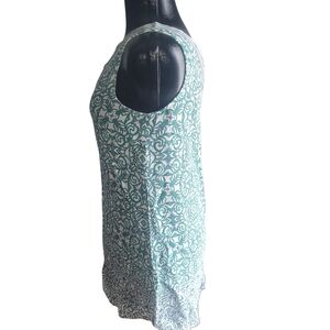 Stylish sleeveless tunic dress with a green and white paisley pattern. Features a V-neck design on front & back.