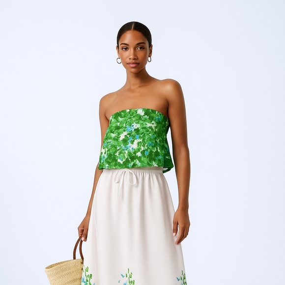 Elegant strapless maxi dress with a vibrant green floral pattern on a white base. Perfect for summer outings.