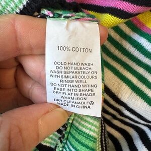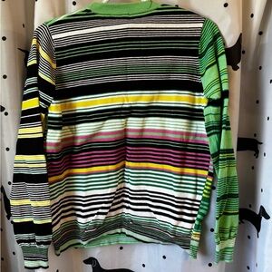 This crewneck sweater showcases a lively striped pattern in green and yellow, offering a fresh and playful look. The medium-weight knit ensures comfort and warmth, making it ideal for cooler weather. Its relaxed fit and consistent stripe design across the garment add to its casual charm.