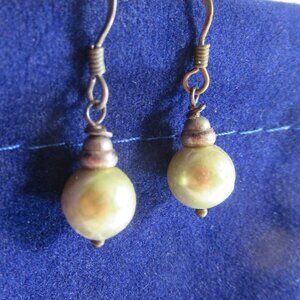 Green faux Pearl Earrings, Dangle, Light Iridescent Olive Green, Vintage, 8mm