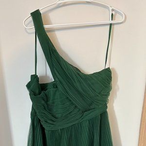 Green midi-length single strap dress. Crepe material, fitted under the bust. Would be great for a wedding guest or prom.