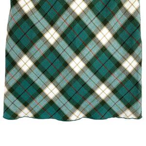 green plaid skirt with a brown velvet waistband and a flower detail on the lower right side. The skirt features a traditional plaid pattern in shades of green, white, and red, with a decorative flower appliqué adds style and detail The hem of the skirt has a scalloped edge, adding a touch of detail to the design.