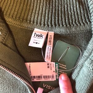 Green ribbed zip-collar sweater new with tags. Ribbed edging, thick knit in a recycled cotton blend (60% reprocessed cotton and 40% acrylic) that have a rustic feeling, ribbed edging, cropped style, loose fit. Colour is accurate in the stock photos, mine are taken in artificial light. Marked size M Medium. All measurements are approximate and taken with the garment laying flat: Pit to pit 20’’ Total length 19’’. This item comes from a smoke free, pets friendly home. Recycled bags/box used when possible. Please, let me know if you'd like any additional info. Thanks for watching!
