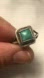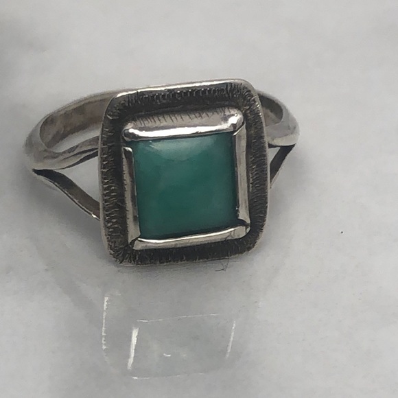 Vintage engraving around the setting. May be glass “stone”, some cracks visible but appears intact & has a lovely colour & sheen - similar to pearlescent paint, colour similar to a chrsophrase. Handmade. Split triangular band. Very likely sterling & fine silver, unmarked.