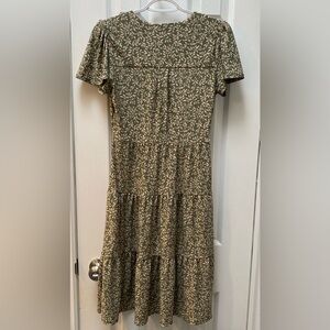 Green tiered button down dress with botanical leaf pattern