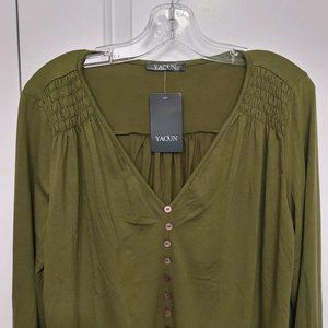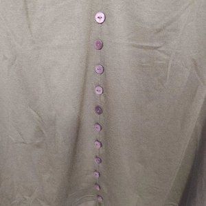 Green top. soft material. hi low in back. great with leggings size large. faux buttons. smocked at shoulders. Size Medium