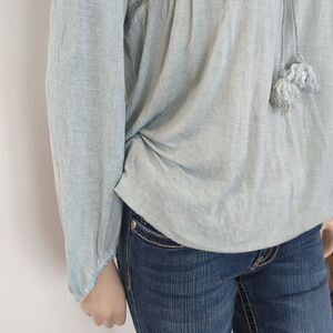 This stylish blouse features a flattering v-neckline and long sleeves, perfect for a relaxed yet chic look. The smocked tie front adds a unique touch, while the soft blue-green colors make it a standout piece for any occasion.