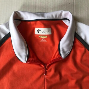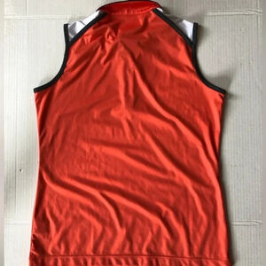 Size small, coral (pictures look orange but it’s more coral I would say) and white and black detailing. 100% Polyester. Play dry fabric wicks away moisture.