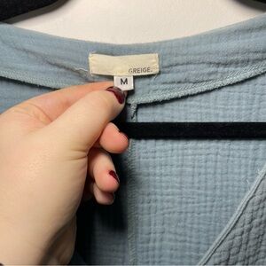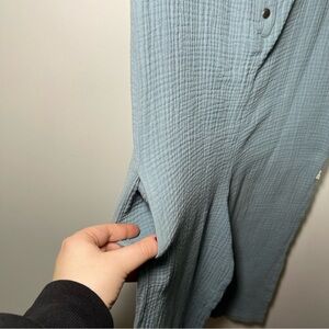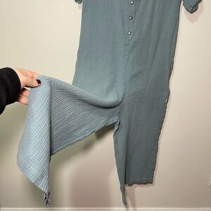 Greige Women's steel blue casual gauzy short sleeve flare leg jumpsuit in M Great condition Size M Featuring pockets style: spring, summer, airy, flowy, lightweight, travel, outdoor, indie, gauzy, oversized, casual, coastal, beachy, pool side, resort wear, boho, flare leg PTP: 18.5" length: 46" inseam: 19.5" ✨ For more information please feel free to contact me or make your best offer ✨ J