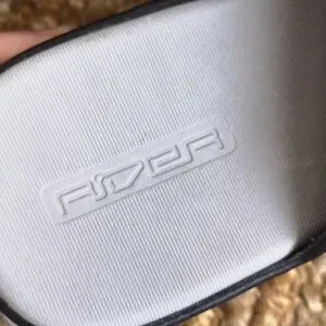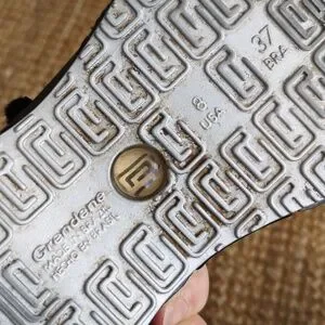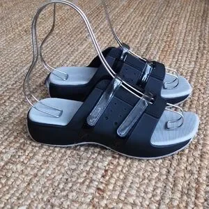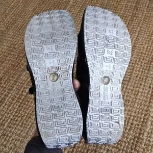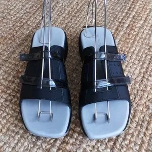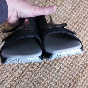 Black Rider slip-on sandals from Grendene. Made in Brazil. Two velcro straps over top of foot. Size 8. Aside from a spot at the back of the left shoe where the little rubber thingy needs some glue (last photo), in excellent used condition.