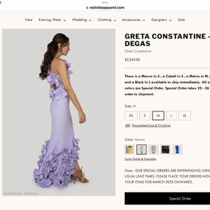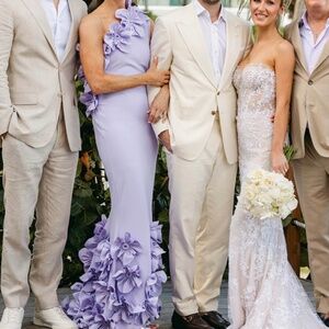 Purchased in Aug 2024 for $2500 from Maxi Boutique in Yorkville. Size medium. Only worn once, in excellent condition, comes with extra flowers if you want to add more. Has a small train that can be bustled at the back.Stretchy fabric is very comfortable. Machine washable, easy to pack and steam if travelling. Note there are a few minor smudges on the inside bottom hem, not visible on the outside, where the gown swept across the floor. I am 5’10” and wore platform shoes, so if it gets hemmed that portion could be removed.