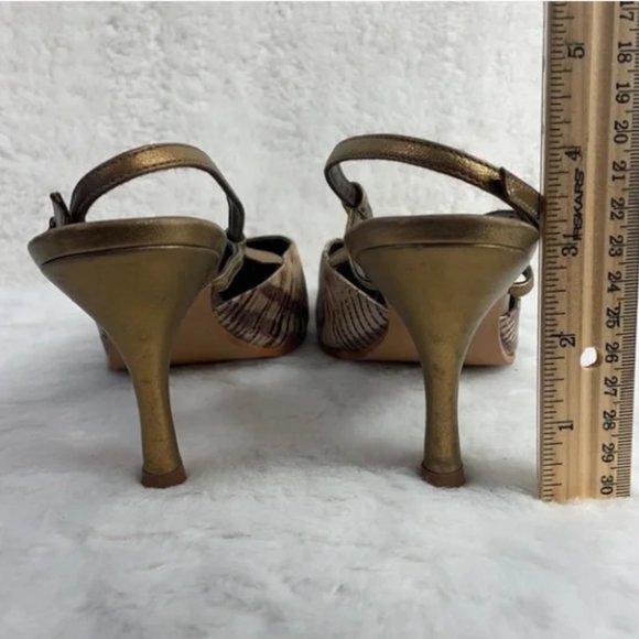 Greta ladies high heel sling back strappy pointed toe heeled shoe with buckle clasp. Gold and brown stripe snakeskin type pattern. Size 37 shoe is women’s 7US