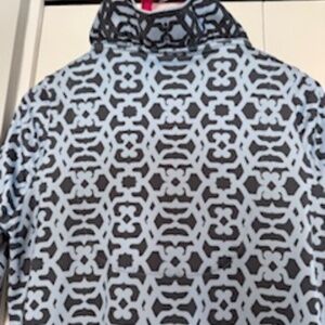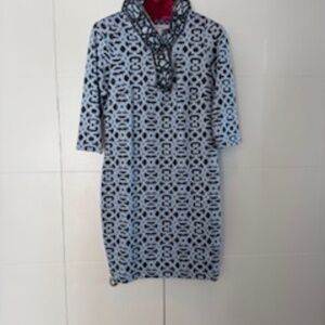 Very feminine and chic mini dress with stand up ruffle neck collar with geometric blue/charcoal color motif.