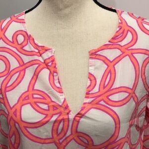 Gretchen Scott cotton tunic blouse beach cover-up size M orange pink geo pattern, 3/4 sleeves, resort wear
