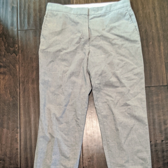 Very light grey colored, has a double clasp and zipper closure. Size 4, fits true to size. Fits at a cropped ankle length (I am approx. 5'5).