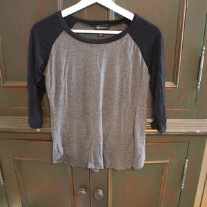 Grey baseball t-shirt that is tight on the arms but flows ones at the bust.