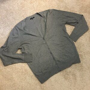 Very good preowned condition, grey, 100% cotton knit, v-neck, grandpa-style sweater by George. Feels like wool, but it is cotton. A nice layering piece.