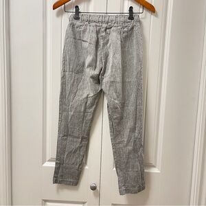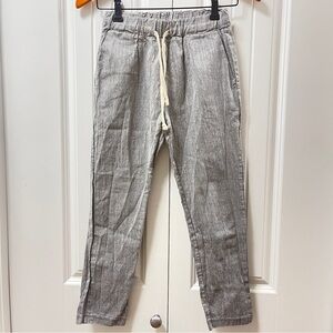 These grey drawstring linen pants are a perfect blend of comfort and style. Featuring a soft, breathable linen fabric, they come with an adjustable white drawstring and an elastic waistband for a secure and customizable fit. Ideal for casual wear or lounging, their minimalist design makes them versatile for various looks and occasions.