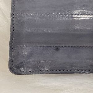 Grey Eel Skin Vintage Wallet With Card Holder Slots, Two Large Side Pockets, A Smaller Pocket & A Zippered Pocket For Security. In Beautiful Condition. Lining Is Clean & Intact. No Tag So I Am Not Able To Identify The Brand. I Received It As A Gift Years Ago. Not Used Very Often. Two Small Discoloured Areas To Note As In The Last Two Photos.