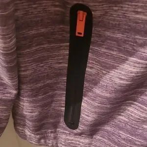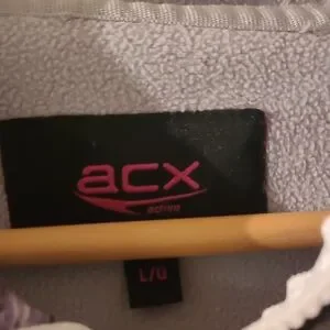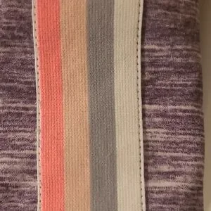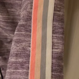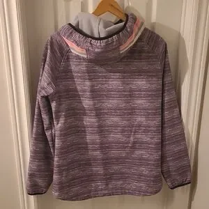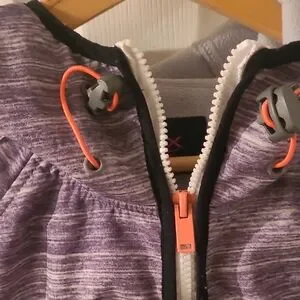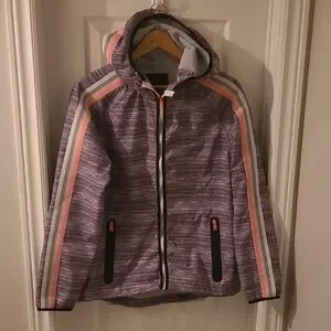 Stylish Grey hooded jacket with colorful striped accents. Features a full zip and two front pockets. Size Large
