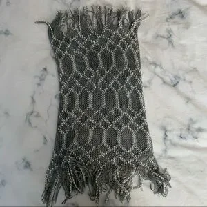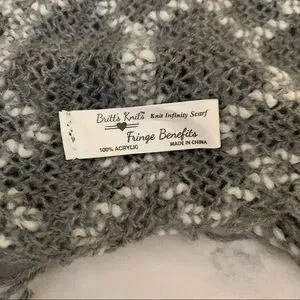 Brand new, never worn, without tags! This is a light grey and white infinity scarf by Britt's Knits. It features fringes on both ends and is a tube infinity scarf, meaning that it is connected all the way around and slides over your head. The scarf is made from 100% acrylic and is the perfect lightweight accessory.