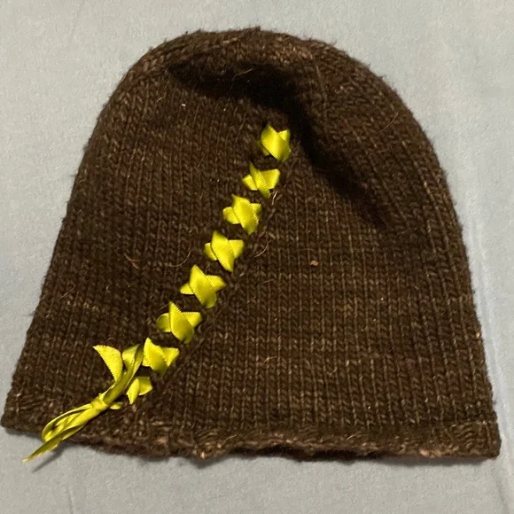 Hand knit Toque with green lace up detail (ribbon can be changed out for ribbon of your preference)
