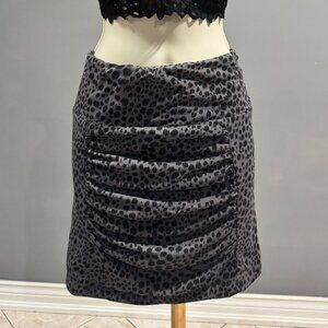 Form-fitting mini skirt featuring a grey and black leopard print with gathered ruching across the front.