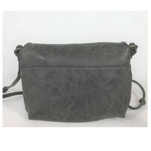Nearly new; no signs of wear. Grey polyvinyl shoulder bag. Strap has decorative knots. Snap flap is zippered around the edge and opens up to another full-size interior pocket. Main inner compartment has one open-top pocket.